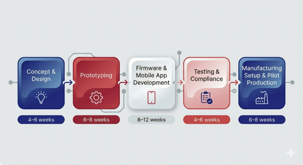 - Firmware and mobile app development: 8–12 weeks