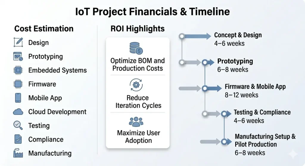 Understanding the financial and time investment in IoT development is crucial. Costs include design, prototyping, embedded systems, firmware, mobile app and cloud development, testing, compliance, and manufacturing.