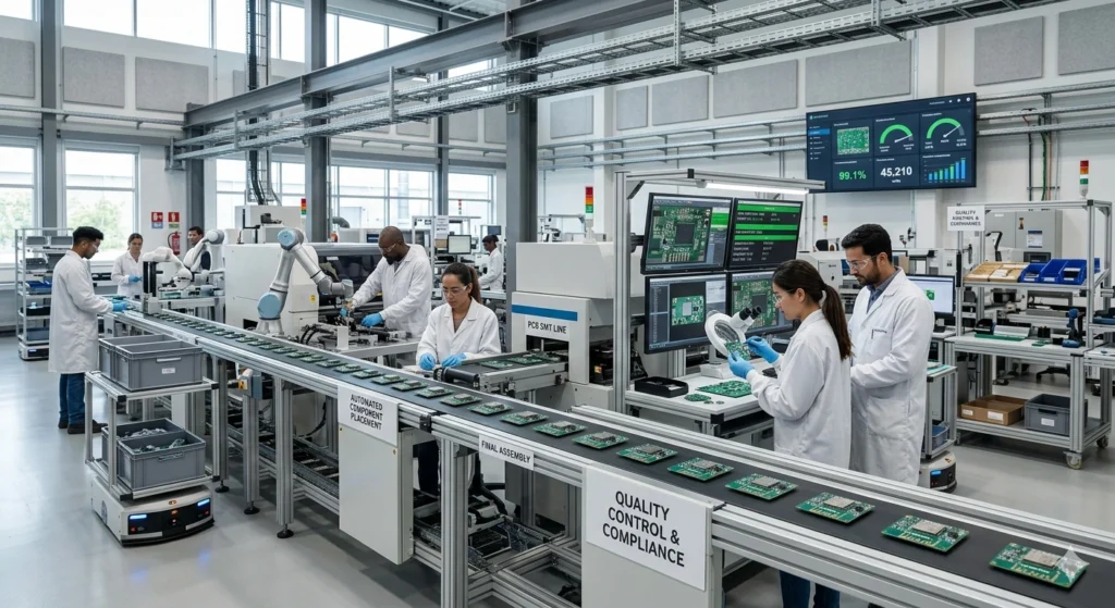 - PCB Assembly (PCBA): Ensures accurate component placement and soldering quality.
